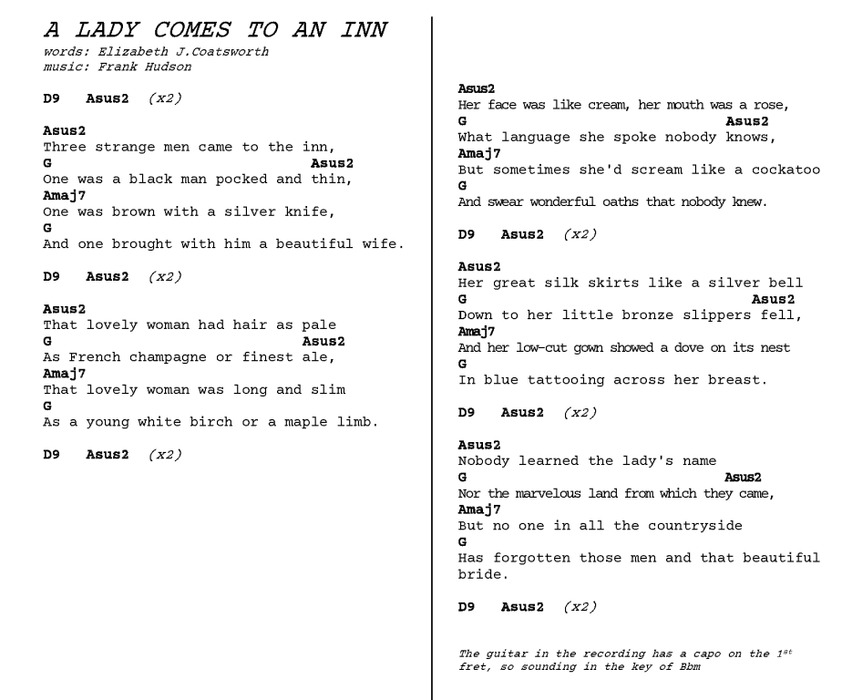 The poem begins when a quartet of strangers comes to an inn. Two of them are described as men of color, a third gets even less description, but he has a wife – the “lady” of the title.