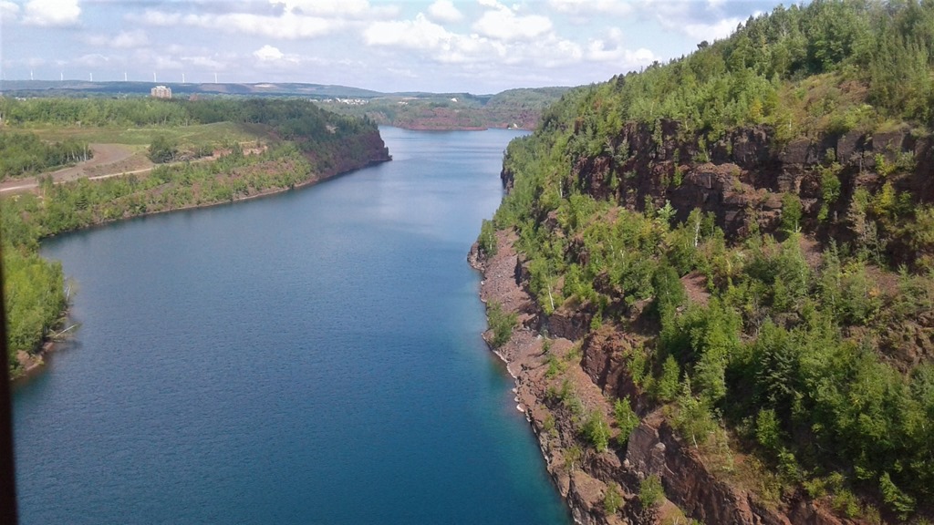 A view from the highest bridge in Minnesota spanning part of a no longer active open pit mine now filled with water outside the town of Virginia. The landscape you are viewing is man-made, not a natural feature.