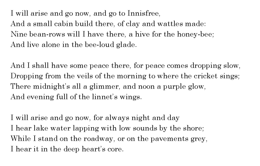 To hear my performance of Yeats’ “The Lake Isle of Innisfree” use the player gadget below. If you don’t see the player (some blog readers won’t show it) then this highlighted hyperlink will also play it.