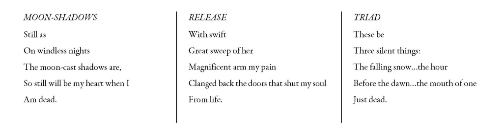In the early 20th century world of Modernist American poetry, her tragic story lent a degree of publicity to the posthumously published book, but it was a small fire which soon burnt out. As I mentioned last time, extremely short poems and the direct lyric impulse is not where Modernism headed after the 1920s—but in the long run, we can still access these poems the only way that poetry can be reached: by directly taking them inside us. These cinquains don’t ask for a large place.