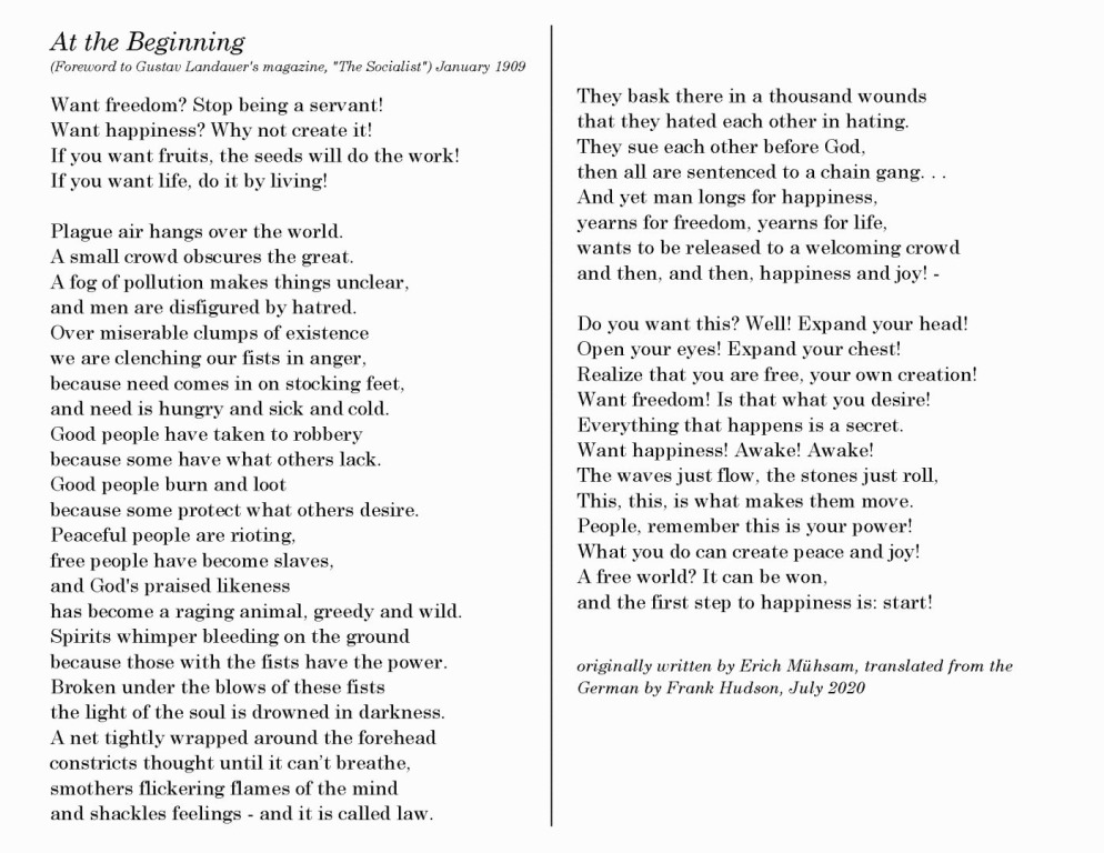 I did a more careful, human, translation of the first poem in that collection, “Zum Beginn “ (“At the Beginning.”) It carries a subheading there telling that “At the Beginning” was first published in Gustav Landauer’s magazine, and given the importance of Landauer to Mühsam and the short interval between the publication date for the collection and Landauer’s death, it’s easy to read it as a comment on what Mühsam learned from his teacher. Here’s my English translation, the one I perform today: