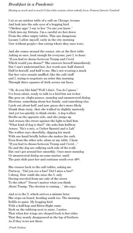 I’ve translated some poems for this project that have few or no translations I can obtain. After all, this project is a strange mix of poems few have heard about and then “poetry’s greatest hits.” There’s a real need for translations of poems that have been overlooked, but I do feel like I’m driving my translation SUV on thin lake ice when I do them. You see, I don’t speak any language other than English. My only academic exposure to languages was high school French, and most of what I learned then was that my mouth and vocal cords couldn’t pronounce French words correctly. Whatever knowledge of French vocabulary, much less verb tenses and syntax, has faded over the decades since. About all that’s left is recognizing a French word that I would have wrestled with as a teenager, sort as if one might recognize someone at a class reunion as someone you used to know even while their name now escapes you.