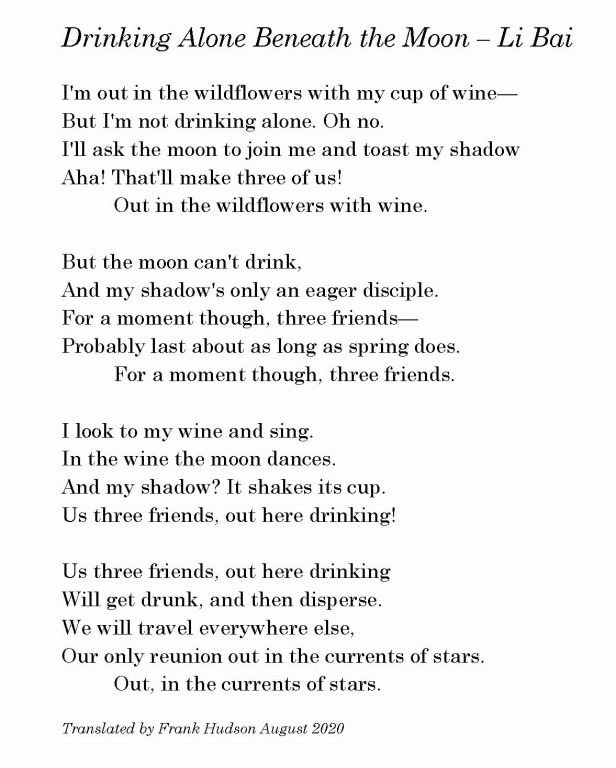 In yesterday’s Li Bai, I added a refrain, a repeated line that wasn’t a set line, and so it has an intoxicated repetition effect. This device wasn’t used by Li Bai. My reading of his poem was that it wants to represent the experience of intoxication progressing to the point of being quite drunk, and this musical device reinforced that.