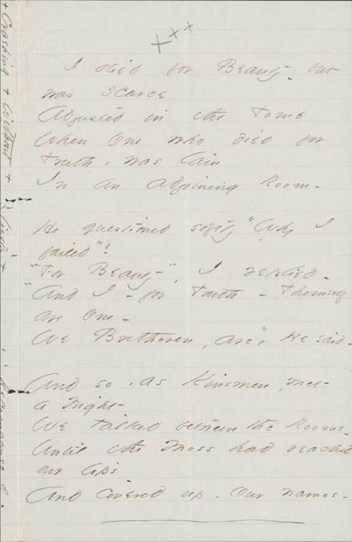 **Original Dickinson editors Mabel Loomis Todd and Thomas Wentworth Higginson removed the quotes Dickinson put around Truth Guy’s question, making it clearly a question to our died for Beauty narrator in their version. So “He questioned softly ‘Why I failed’?” in Dickinson’s hand then became “He questioned softly why I failed?” on first printing.