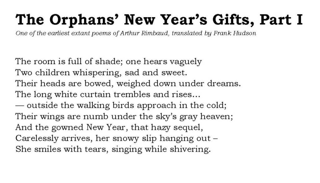 Last time I said I looked through Arthur Rimbaud’s collected works in the middle of the nighttime looking for something to translate, combine with music, and perform. I guess I could have saved myself some time, because I eventually chose the first poem in the collection, The Orphans’ New Years’ Gifts, placed first because it was the first poem he ever published. When it appeared in print on January 2nd, 1870 Rimbaud was all of 15 years old.