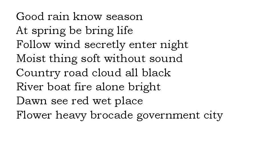I think of my opening section as a good faith attempt at an accurate translation into a working English poem. I used English syntax and conventions, added the poetic device of parallelism to substitute for the word-music losses inherent to translation, and tried, as I always do, to present vivid images.