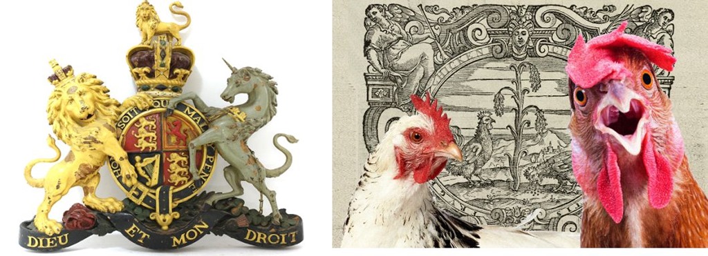 “Cock-Crow” is a little 8-line poem describing awakening from disturbing or unresolved dream-sleep, or lack of it, to a set of chickens — not hanging out round a New Jersey wheelbarrow, but amusing Thomas with the bird-pair’s face-to-face rural dramatization of a veddy British heraldic motif. Is Thomas simply smiling at that coat-of-arms likeness, or is there a resonance toward Britain’s more overt class structure?