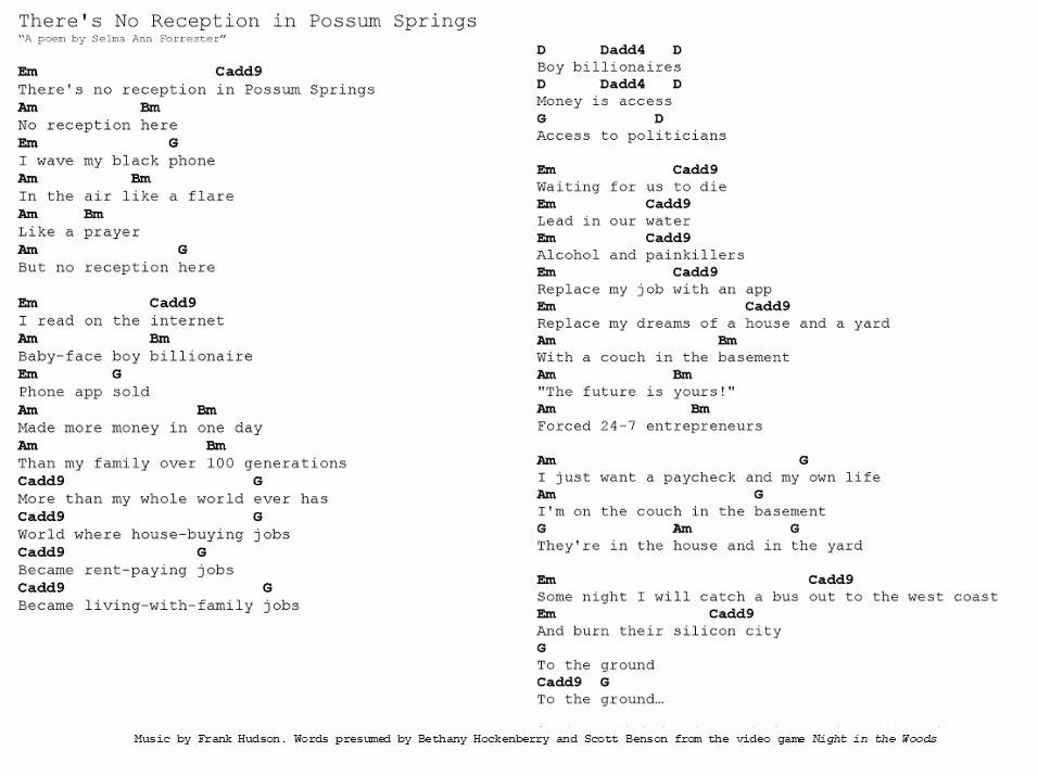 Still here. Good — because the poem is excellent, and we’ll get to it in a moment. First, a short summary of the context it came from. The video game is titled Night in the Woods.It’s now around 5 years old, and it seems to this outsider to have an unusual premise: it revolves around teenagers and their peer relationships in a declining industrial town of Possum Springs. There’s a mystery to be solved, at least after a fashion, but the richness of the characters and their milieu makes it more a novelistic experience than a puzzle escape room or series of mini to macro baddies to battle. Oh, and did I mention that the characters are anthropomorphic animals?