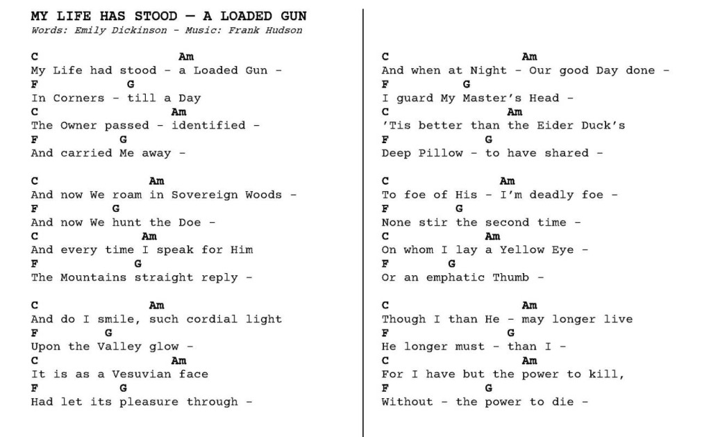 This Emily Dickinson poem tracks like many others of hers: a vivid set of images, so unexpected in its choices and details finished with a gnomic conclusion that puzzles as well as tantalizes. Last time we had her famous “My Life had stood — a Loaded Gun.” Today’s lesser-known poem is just as weaponized. I find it as strong as “Loaded Gun” — Dickinson, powerful enough as a writer to bring the proverbial knife to a gun fight. Here’s a link to the poem “She dealt her pretty words like Blades” in case you’d like to follow along.