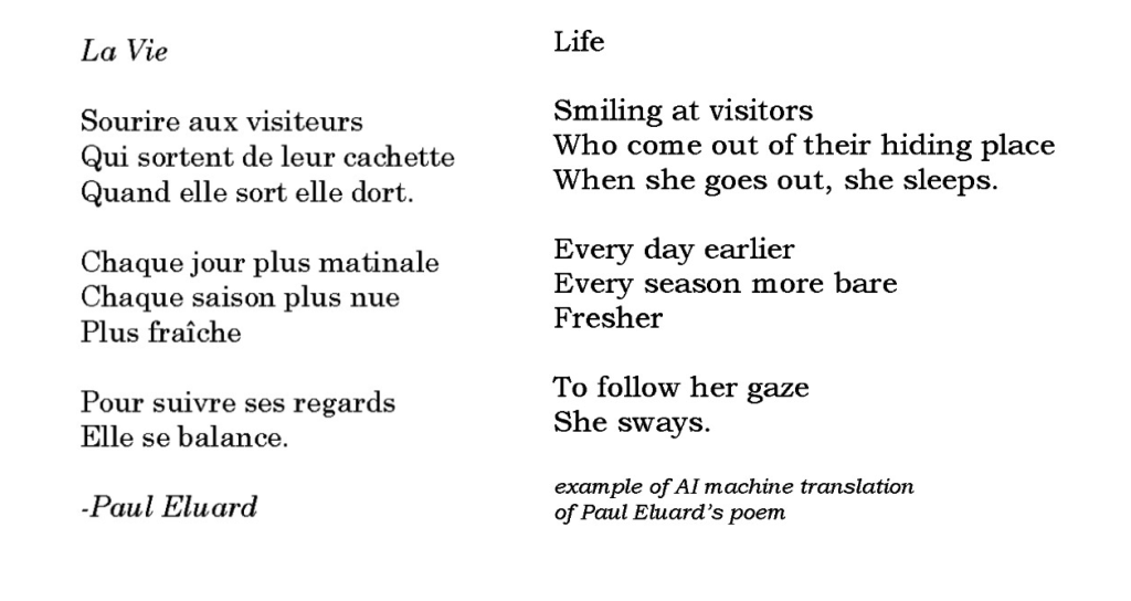 So, here we go: an early poem by French Surrealist Paul Éluard, “La Vie.” I start with a machine translation.