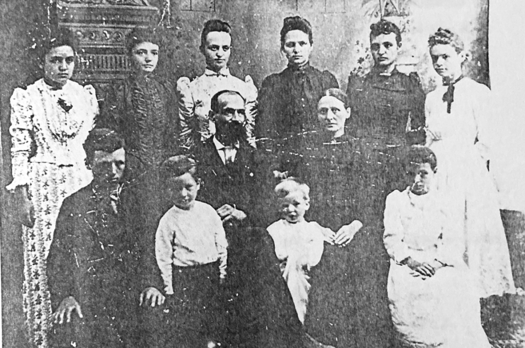 “From Kisses we make mankind:” Dave and Susan Hudson with 10 of their (take that Nigel Tufnel) 11 kids. The tallest boy on the front left is Frank Hudson, my great-grandfather (who looks a lot in this picture like my dad in his younger years).