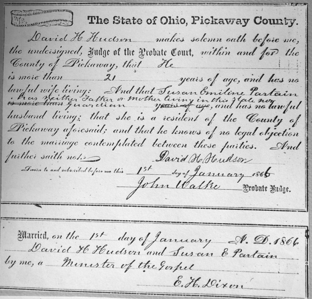 We also don’t know everything Susan’s family felt. Hudson family lore says they might have had Union sympathies, but also that they weren’t supportive of Susan’s romance with the soldier. In the summer of 1865, Susan’s mother died, and that may have broken some constraints for her. David, still stationed in the south, was mustered out in October 1865, and he and Susan eloped off back to Ohio for that New Year’s wedding.
