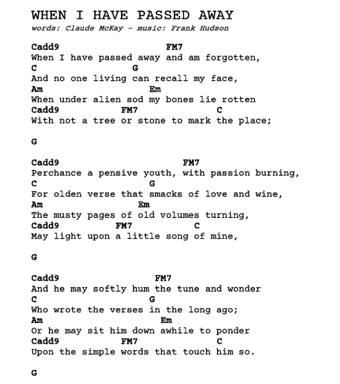 Here’s another short poem by Claude McKay made into a song. In his “When I Have Passed Away” a young poet seems to be imagining his own legacy – a prediction both restrained and hopeful. As in the first poem of this Black History Month series featuring his poetry, McKay will subtly mention two things that are potentially othering his living voice. Within the poem’s first quatrain he writes of a belief that he, the author, will likely be forgotten and uncelebrated. He posits an unmarked grave, which strikes one as a sad conclusion, but I think his second line “And no one living can recall my face” has an element of release. In this obscure future a reader will likely not know his black-skinned face, that instant, contemporaneous, racial stereotyping will have been overthrown by a forgetting time that has discarded his particular self. And as in “The Cities Love,” he will remind us that he’s writing this as an immigrant, who will likely die and be buried away from Jamaica, the country of his childhood, in “alien sod.”