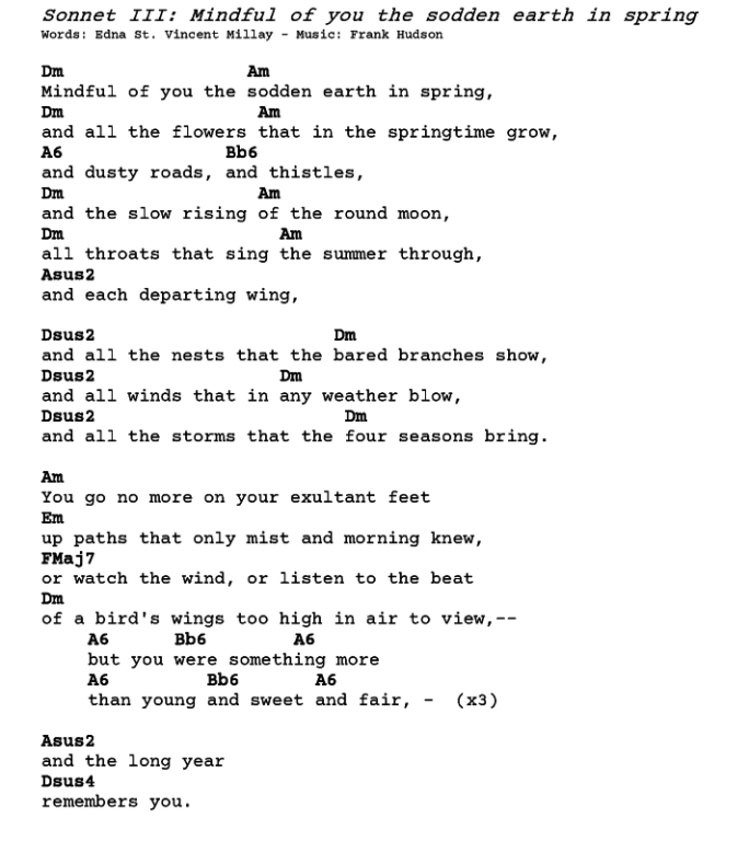 I’ve found that Millay’s poems often improve with performance. While not exactly a slam poet with planned-in applause lines, Millay’s language (even with its touch of archaic poetic diction) has a pleasing sound, and near rhyme and rhyme add a sensuous chime to the lines. It really is one of those poems that ask to be sung. That said, I found myself modifying Millay’s line breaks as I set it to music. The chord sheet version I provide today can be compared to this link of the printed text to see how I adapted it. I also added a refrain again.