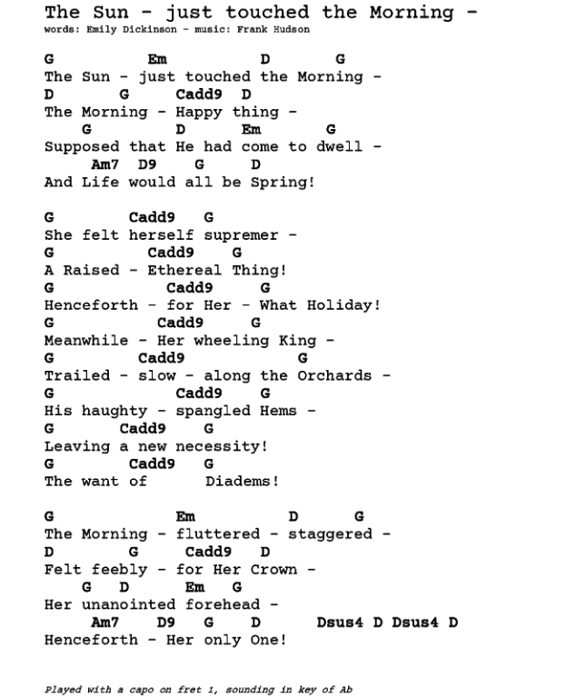 You can hear this song version of Emily Dickinson’s “The Sun – just touched the Morning”  with the audio player below. What? Has the king refused to fund any such audio player? No, it’s just that some ways of reading this blog won’t show the player, and I offer this highlighted link which will open a new tab with its own audio player so you can hear it.