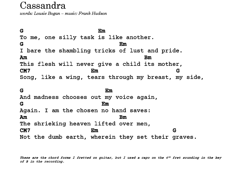 I tried quite a full arrangement of the music I wrote for this, with two tracks of Mellotron wheezing and some other things, and yet I struggled to come up with a mix that retained listener impact. This afternoon I decided to subtract, taking away track after track until I had just the voice, guitar, and bass – and sure enough there was more there with less. You can hear my performance of Louise Bogan’s “Cassandra” with the audio player below. What, has my prediction failed – there’s no player to be seen? No, I know that would happen since some ways of reading this won’t show the player, and so I offer this highlighted link that will open a new browser tab with its own audio player.