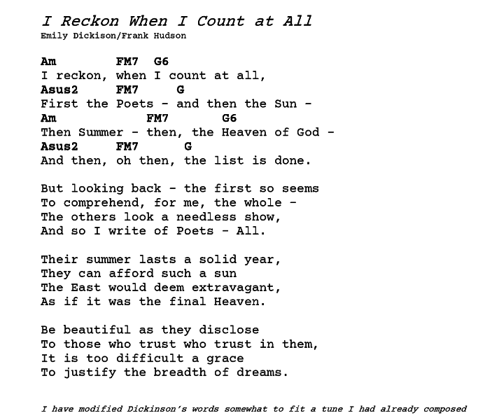 Everything I did there is not necessarily the admirable choice. I really wouldn’t know how to defend myself from charges of defacing the work of a great poet. I was guided by trying to make as arresting a song for the listener as I could – and I was thinking too about using this for the 900th Parlando piece – I was “counting” that occasion, and so like the poem I adapted, commenting on the ambiguity of counting poetry and the length of this Project. Did I make it interesting? You can hear my performance of “I reckon, if I count at all”  with the audio player below. No player? Well, you can’t count on that, because some ways of viewing this blog won’t show it, but this highlighted link will open a new tab with an audio player.