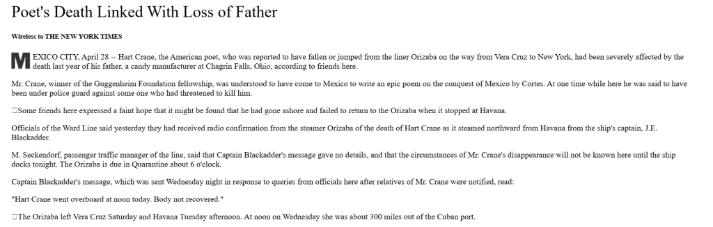 Things modern will soon seem quaint. As terrible as the news conveyed in this circumspect newspaper report reads to me today, with it’s sea voyage delays, creaky “wireless,” and a “Captain Blackadder,” it seems of another age. The father mentioned had disowned Hart Crane, and that family wealth involved was based on a type of candy: the round hole-in-the-middle Lifesavers.