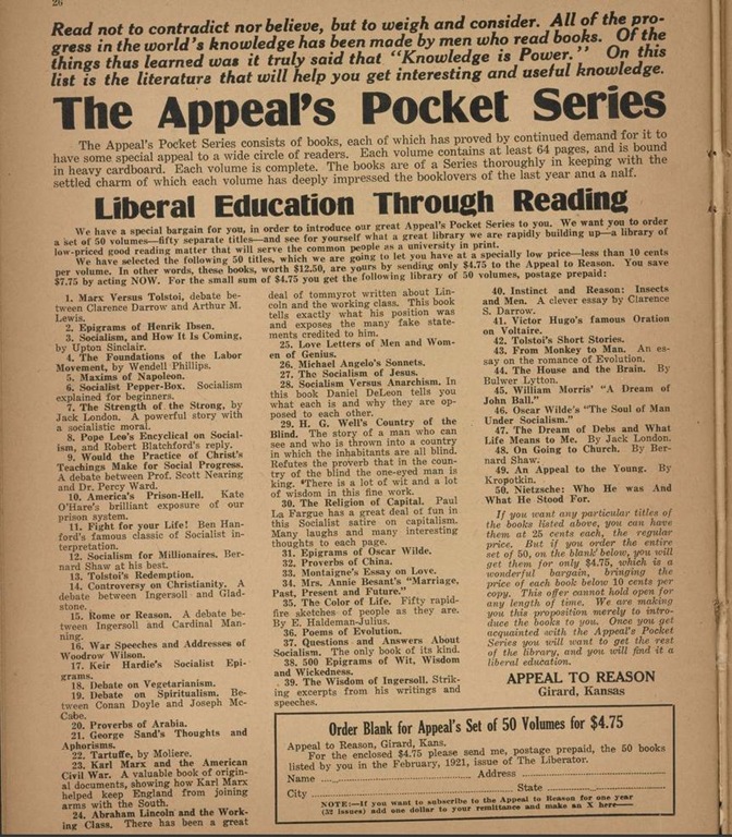 Doomscrolling in the 1920s? Michael Angelo’s Sonnets, Tolstoy, William Morris, Shaw, Voltaire, Wilde, and Nietzsche. Also socialism and the story of what Karl Marx did during the American Civil War. 10-50 cents a piece, or all 50 for $4.75. If one can’t sleep after a long workday, such a TBR pile near your bed could reach out to you.