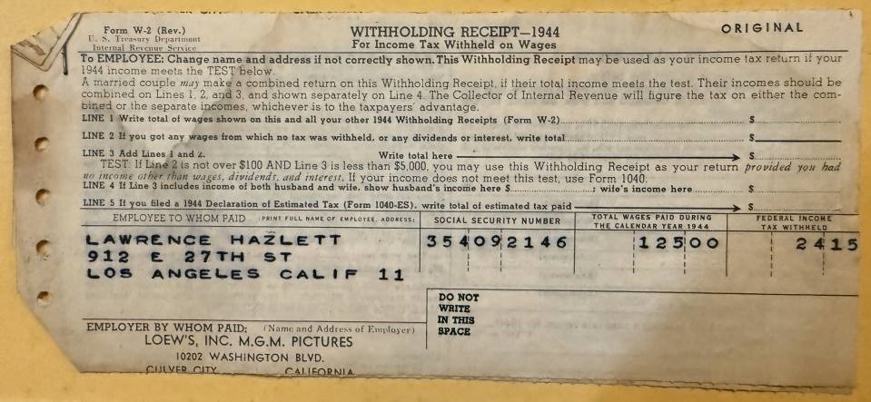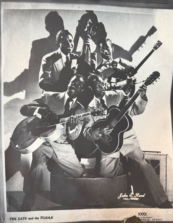*Marv Goldberg mentions that the Cats and the Fiddle might have had some involvement with the 1945 MGM Judy Garland film The Clock, which would have been several years and lineups past the original Cat’s quartet burst of Hollywood film appearances in 1938 — those all even before they had made their first appearance on recordings. A 1945-released film would have overlapped the time that Hazlett was in the Cats, could explain the 1944 W2. Mysteriously, I distinctly recall seeing a clipped advertisement for that movie when I first looked into the scrapbook years ago, thinking I should check the film out — but for some reason it isn’t in the scrapbook now.