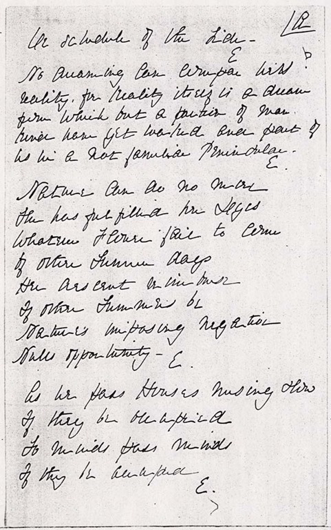 Dickinson’s “Nature can do no more” in manuscript. Above the poem she wrote: No dreaming can compare with reality, for reality itself is a dream from which but a portion of mankind have yet worked and part of us in a not familiar Peninsula.“