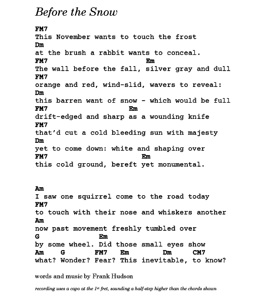 Here’s an early song of mine, recorded on primitive equipment before the nearing 900 songs of the Parlando Project had started counting off, but consistent with its principles, a setting of John Keats’ “In the Drear Nighted December.” Audio player gadget should be below, but if not, this highlighted link will open a new tab with its own audio player.
