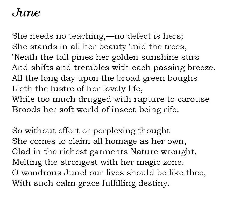 It’s time once more to perform the brilliance of Emily Dickinson. Today’s text, “Answer July” is Dickinson in her seeming simple mode. Read quickly, it might strike one as almost a nursery rhyme or maybe as one of those playful listing or counting folk songs. Here’s a link to the full text of the poem.